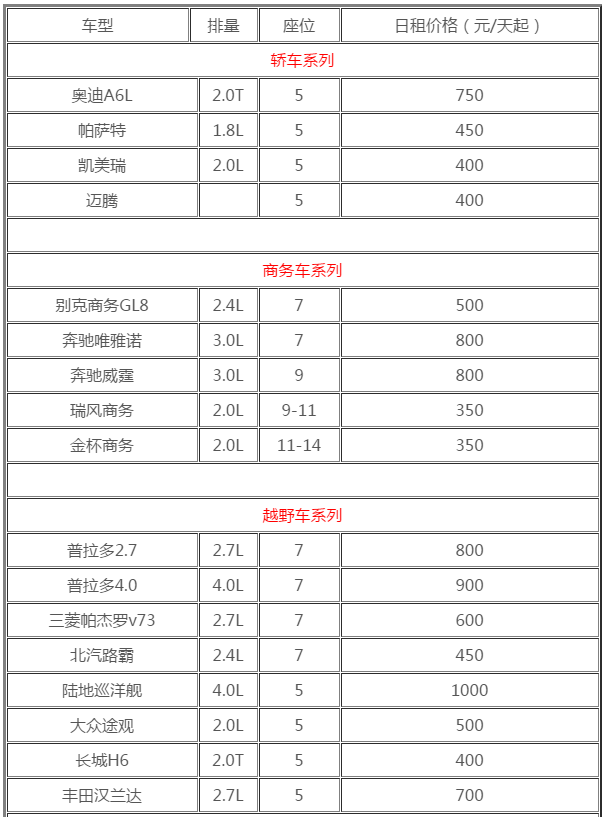以上是“成都汽車(chē)租賃報(bào)價(jià)表”清單,可看出車(chē)輛租金是根據(jù)車(chē)輛類(lèi)型、行程天數(shù)來(lái)決定租金的多少。當(dāng)然成都租車(chē)的方式多種多樣,租車(chē)、包車(chē)、拼車(chē)、自駕等,想要價(jià)格實(shí)惠可以選擇拼車(chē)是最節(jié)省的。但是為了旅途更加方便選擇包車(chē)的也不在少數(shù),甚至是占租車(chē)的絕大部分。
